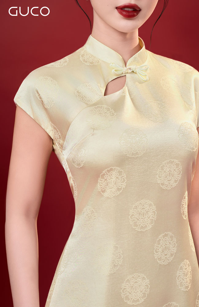 Thiết kế sườn xám cách điệu mang vẻ đẹp giao thoa giữa nét truyền thống Á Đông và phong cách hiện đại, giúp tôn dáng thanh thoát và đầy nữ tính. Gam màu vàng trang nhã kết hợp họa tiết hoa cách điệu tạo cảm giác sang trọng, nổi bật nhưng vẫn giữ được sự tinh tế, rất phù hợp cho các dịp lễ, sự kiện, tiệc trang trọng hay những buổi gặp gỡ đặc biệt.
