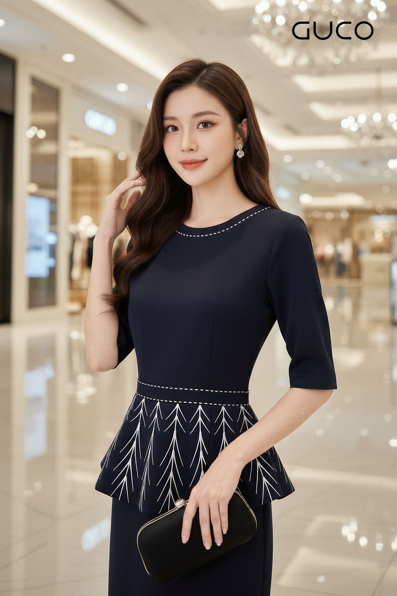 Thiết kế peplum tay lỡ thanh lịch giúp tôn vòng eo thon gọn và tạo hiệu ứng dáng cân đối, phù hợp nhiều vóc dáng. Điểm nhấn thêu viền trắng tinh tế nổi bật trên nền xanh đen sang trọng, mang đến vẻ ngoài vừa hiện đại vừa cuốn hút.