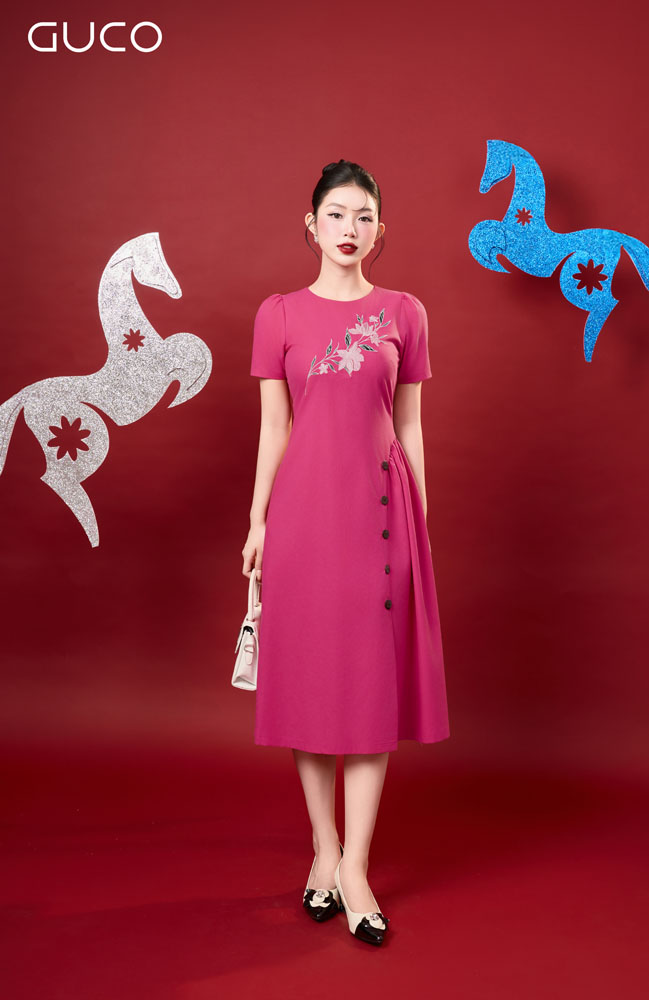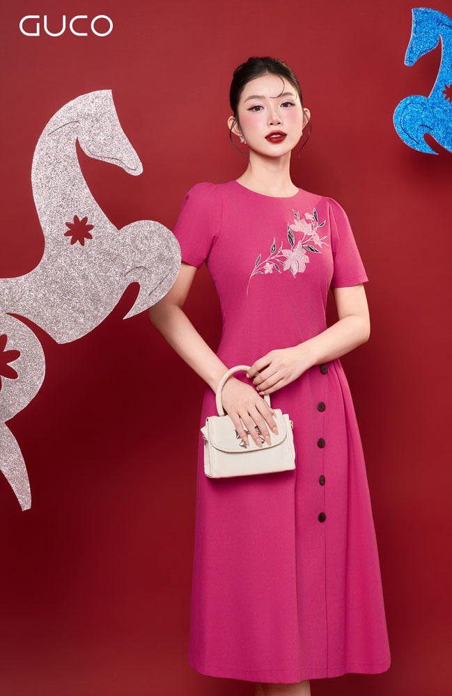 ĐẦM A CỔ TRÒN THÊU HOA TRƯỚC NGỰC – HỒNG