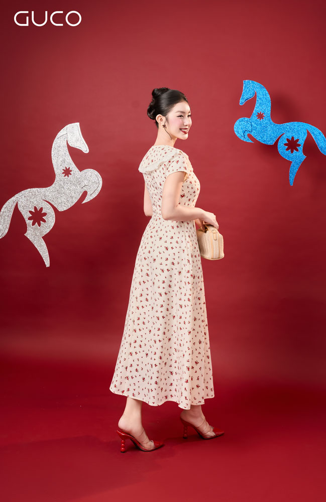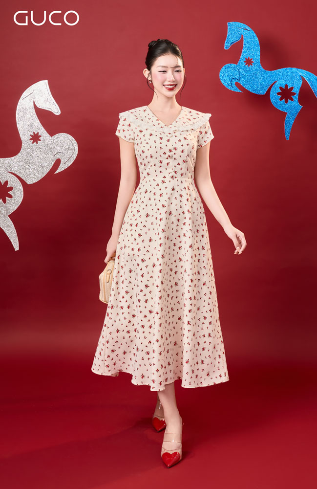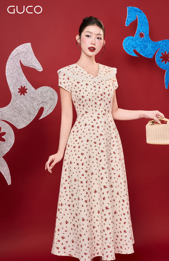 Thiết kế dáng xòe nhẹ nhàng mang lại cảm giác nữ tính, bay bổng và giúp che khuyết điểm vóc dáng hiệu quả. Phần cổ tim duyên dáng được phối ren tinh tế tạo điểm nhấn mềm mại, tôn lên nét ngọt ngào và thanh lịch cho người mặc. Nền màu kem trang nhã kết hợp họa tiết hoa nhí đỏ nổi bật vừa đủ, mang lại tổng thể hài hòa và cuốn hút.