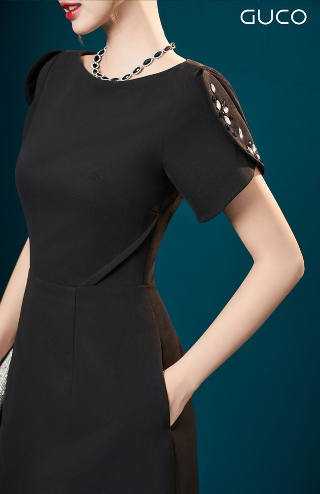 ĐẦM A DỰ TIỆC TAY ĐẮP ĐÍNH ĐÁ - ĐEN - 5028