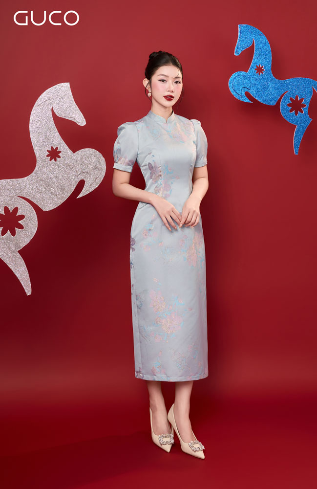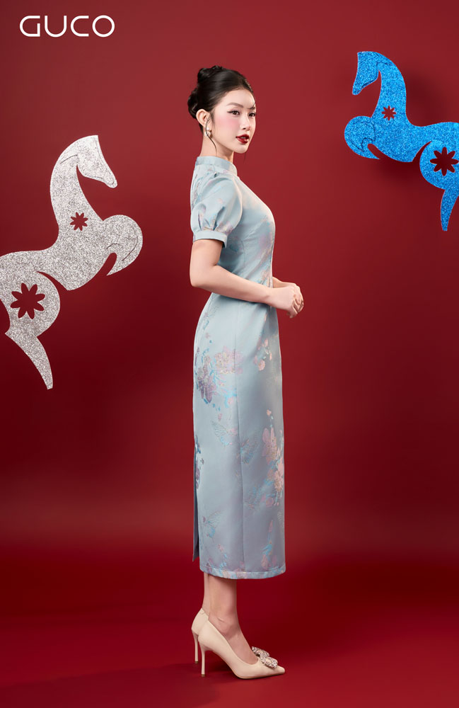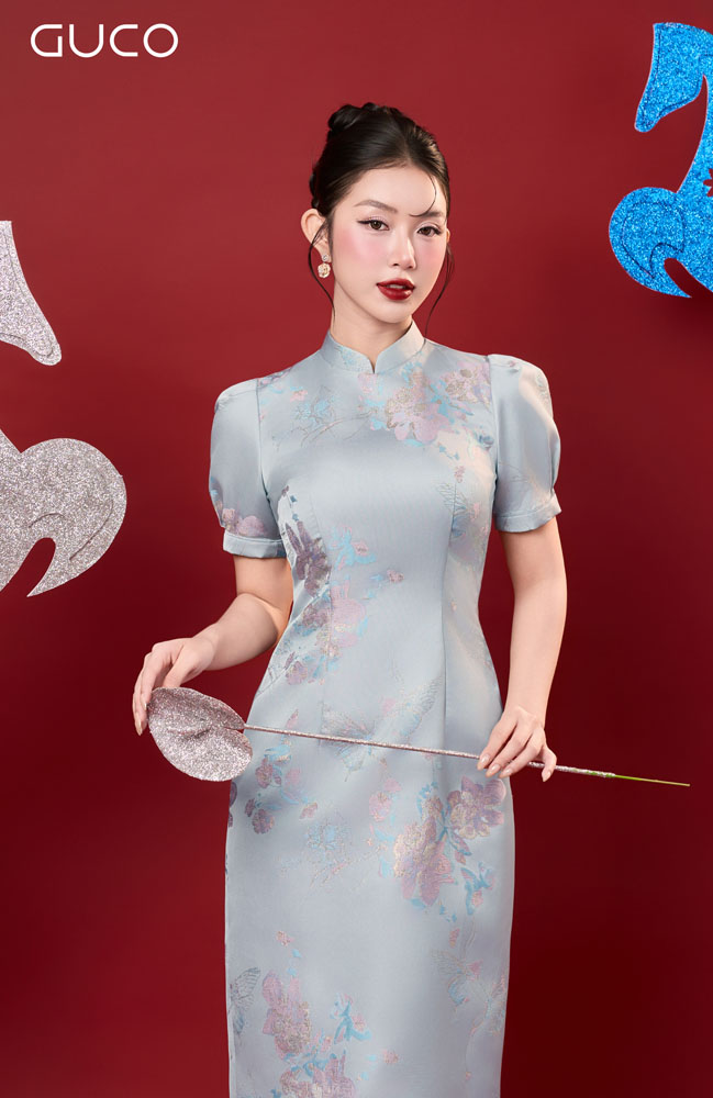 Thiết kế dáng A nhẹ nhàng giúp tôn vòng eo và tạo cảm giác thon gọn, dễ mặc cho nhiều dáng người. Phần cổ tàu thanh lịch mang nét đẹp truyền thống Á Đông, được kết hợp hài hòa với phom dáng hiện đại, tạo nên tổng thể duyên dáng, kín đáo nhưng vẫn nổi bật. Họa tiết hoa xanh trang nhã mang đến cảm giác tươi mới, dịu mắt và đầy tinh tế.