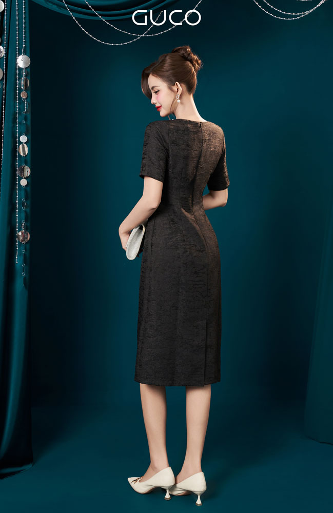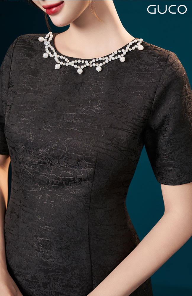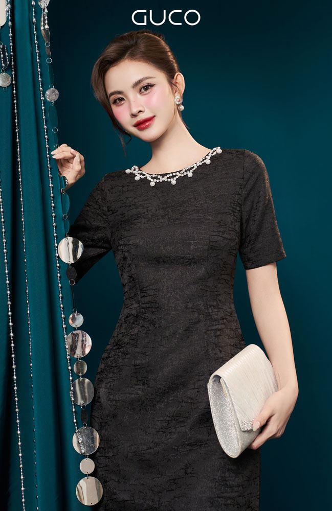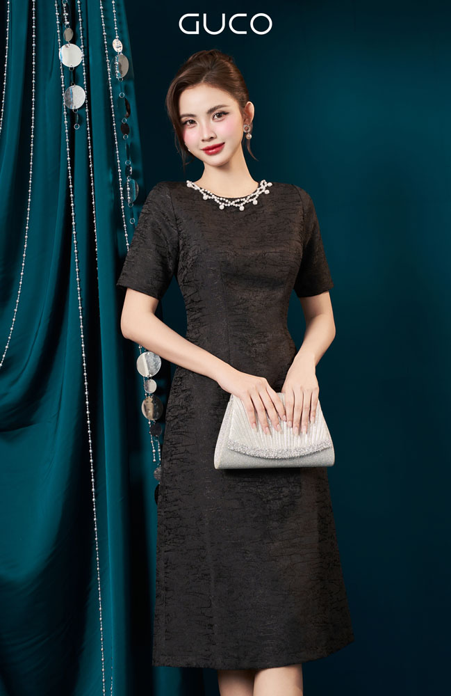 ĐẦM A TAFFTA CỔ TRÒN ĐÍNH NGỌC TRAI - ĐEN - 5025