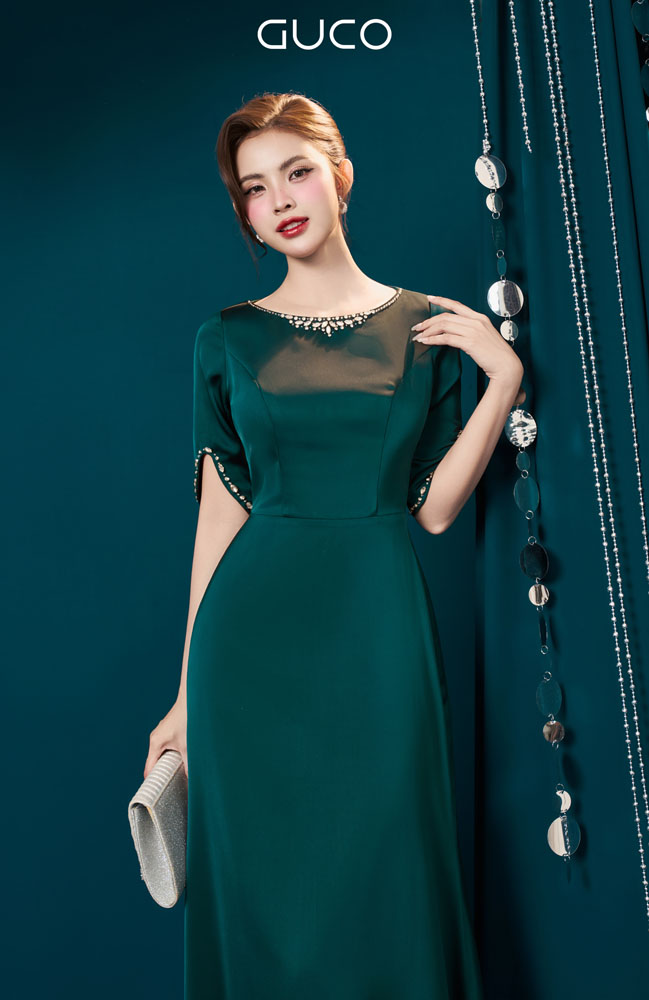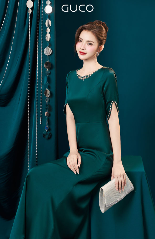 ✨ ĐẦM DẠ HỘI CỔ TRÒN TAY XẺ ĐÍNH ĐÁ – XANH SANG TRỌNG & QUYẾN RŨ ✨