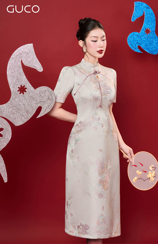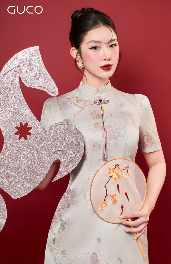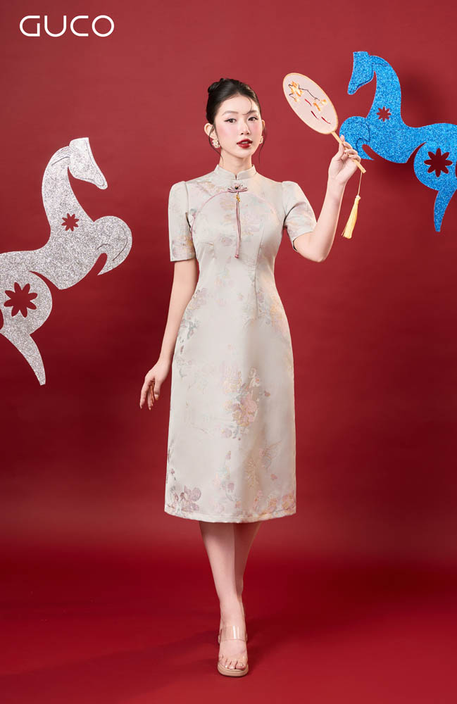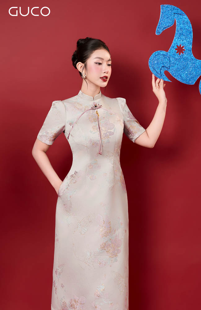 Thiết kế dáng A thanh lịch giúp tôn vòng eo, tạo cảm giác thon gọn và dễ mặc cho nhiều vóc dáng. Phần cổ tàu truyền thống được cách tân tinh tế, mang lại vẻ đẹp kín đáo nhưng vẫn hiện đại. Họa tiết hoa kem nhẹ nhàng trên nền gấm tạo cảm giác trang nhã, sang trọng và rất dễ ứng dụng trong nhiều dịp khác nhau.