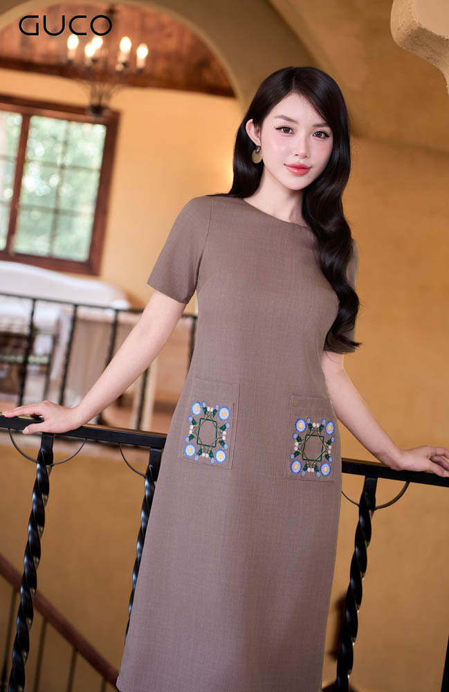 GUCO Đầm Suông Nâu Thêu Họa Tiết – Mộc mạc, tinh tế và đầy cuốn hút