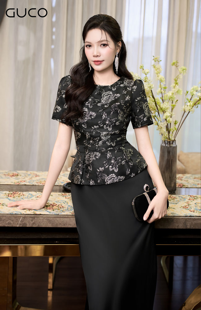 Tỏa sáng trong những buổi tiệc với mẫu đầm dự tiệc áo gấm hoa phối tùng đen, thiết kế mang vẻ đẹp quý phái và hiện đại. Phần áo gấm taffta cao cấp nổi bật với họa tiết hoa tinh tế, bề mặt bóng nhẹ sang trọng, đứng phom giúp tôn lên vóc dáng thanh lịch.