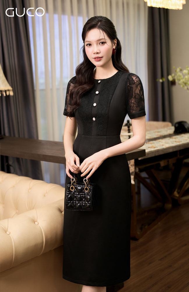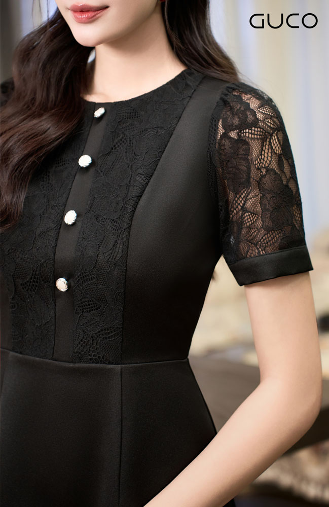 Đầm Dự Tiệc Phối Ren Đính Nút - Đen - 5016