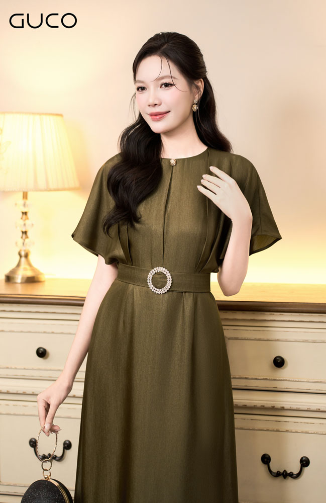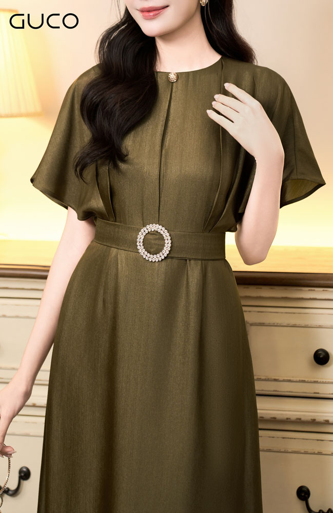 Đầm Xoè Cổ Tròn Tay Liền Thân Kèm Belt - Xanh Rêu - 4958