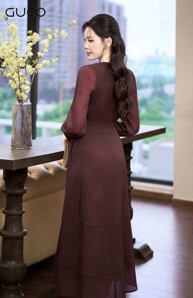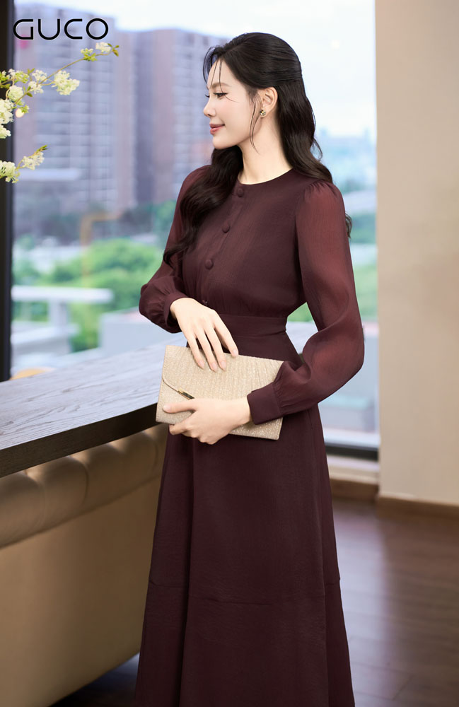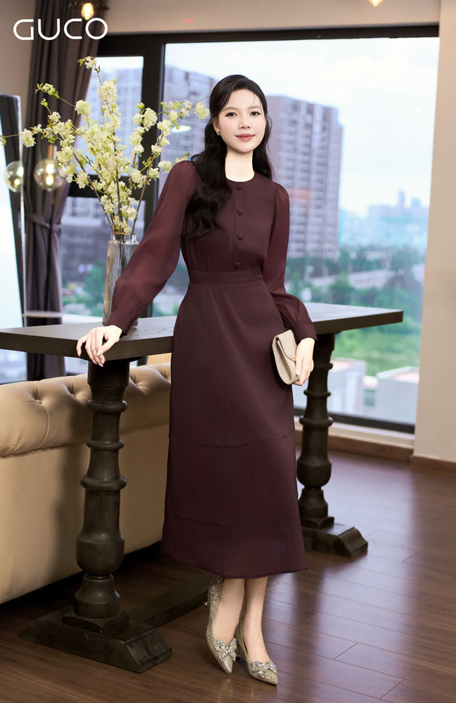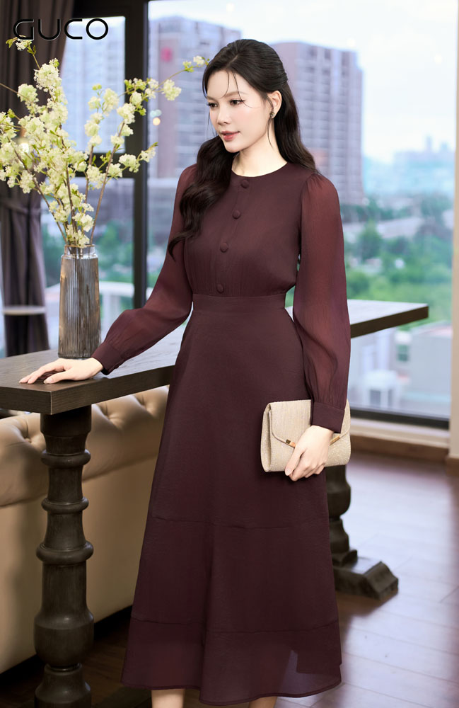 Nâng tầm phong cách thanh lịch với đầm xòe tay dài, cổ tròn được viền tinh tế, tôn nét nữ tính mà vẫn sang trọng. Gam đỏ đô ấm áp giúp nàng nổi bật, thích hợp cho mọi dịp dự tiệc, họp mặt hay những buổi tối sang trọng.